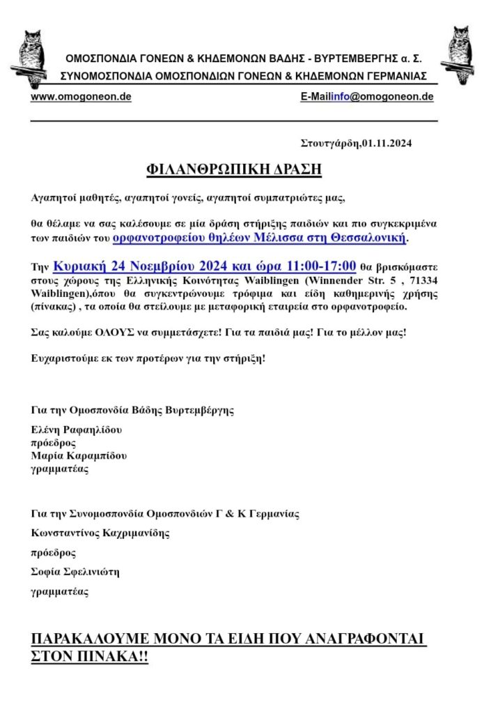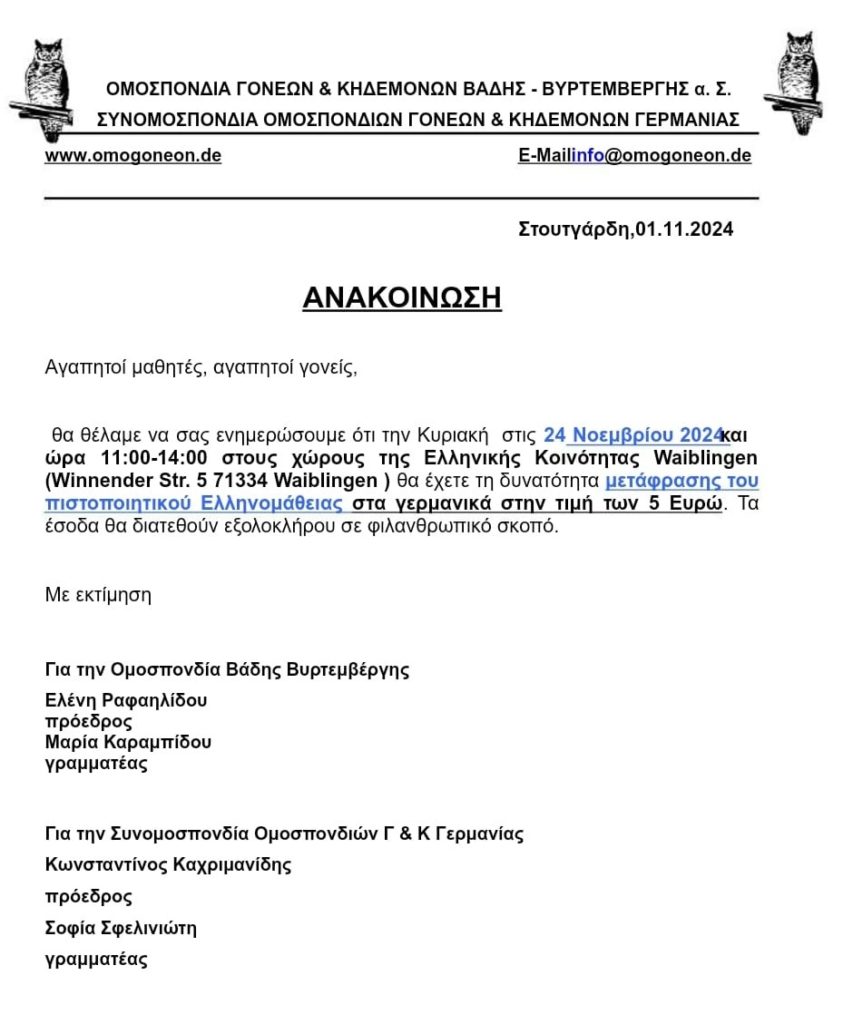Ευχαριστούμε την ορκωτή μεταφράστρια κα Μαρία Παπαδοπούλου που στηρίζει εδώ και χρόνια την δράση, την Ελληνική Κοινότητα Waiblingen Griechische Gemeinde Waiblingen για την παραχώρηση του χώρου και φυσικά τα διοικητικά συμβούλια των συλλόγων γονέων και κηδεμόνων που στηρίζετε τις δράσεις ενημερώνοντας πάντα τους γονείς!